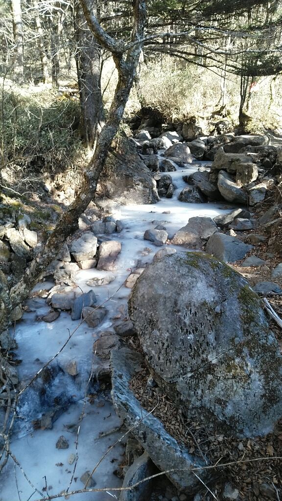 勝縁荘前の姫の井沢は全面凍結。岩魚沢のちょろちょろ水を